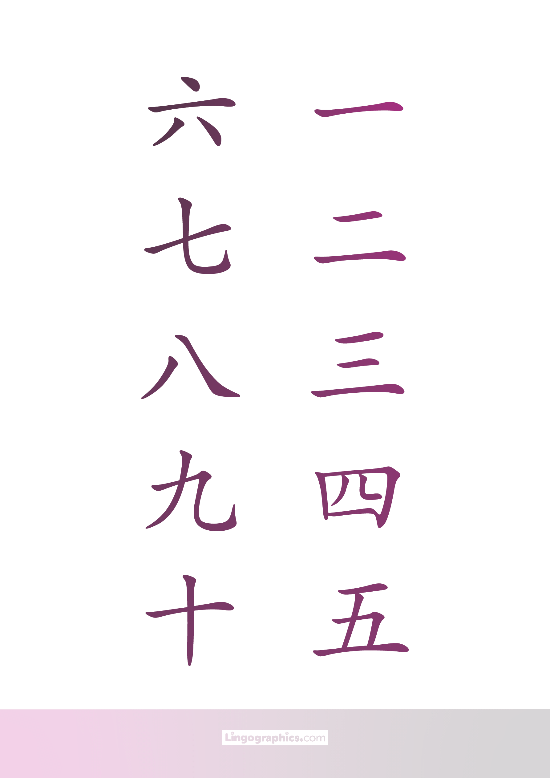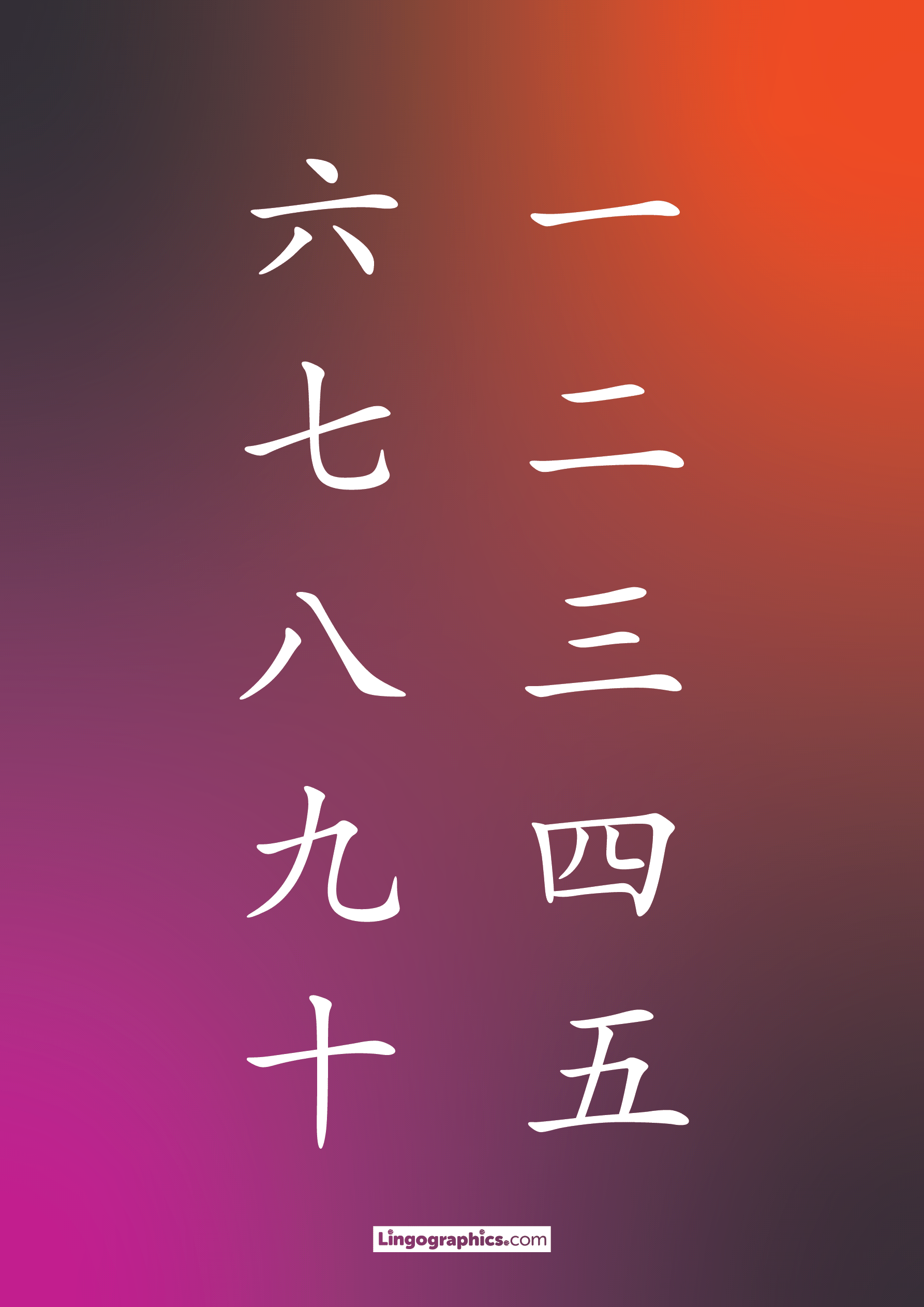 Kanji for Numbers 1 – 10 Japanese Kanji for numbers 1 to 10 in columns from right to left. Download PDF Choose format: pdf a4 color light Downloaded 22682 times pdf a4 color dark Downloaded 4661 times pdf a4 photocopiable Downloaded 4265 times png color light Downloaded 2928 times png color dark Downloaded 2805 times png black&white Downloaded 3055 times Lingographics2022-09-30T23:31:26+00:00January 21st, 2021|Categories: Japanese|Tags: Kanji, Numbers| Related Posts JLPT N1 Kanji March 21st, 2025 | 0 Comments Grade 1 Kanji October 17th, 2022 | 0 Comments JLPT N2 Kanji October 10th, 2022 | 2 Comments JLPT N3 Kanji September 20th, 2022 | 1 Comment JLPT N4 Kanji September 17th, 2022 | 0 Comments Kanji for Numbers 1 – 10,000 and Zero January 17th, 2021 | 0 Comments JLPT N5 Kanji (Custom order) September 29th, 2018 | 3 Comments Katakana Cheat Sheet September 24th, 2018 | 2 Comments Hiragana Cheat Sheet November 19th, 2015 | 0 Comments Japanese Hiragana and Katakana Chart / Cheat Sheet (Side by Side) May 19th, 2015 | 0 Comments Japanese Katakana Chart May 2nd, 2015 | 2 Comments Japanese Days of the Week November 11th, 2014 | 0 Comments Hiragana Chart August 22nd, 2014 | 5 Comments Leave A Comment Cancel replyComment